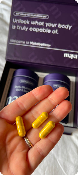 For best results, take Maya Metabolism+ 30–45 minutes before your two biggest meals of the day. This gives Metabolism+ time to work its magic and help with fullness before food enters your stomach, avoiding any potential discomfort from feeling too full as you’re eating.